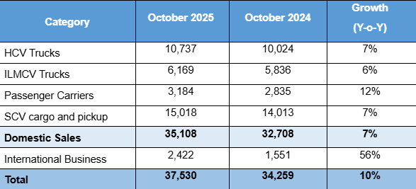 Domestic sales of MH&ICV in October 2025 were 16,624 units vs 15,574 units in October 2024. Domestic & International sales for MH&ICV in October 2025 was 17,827 units vs 16,274 in October 2024.